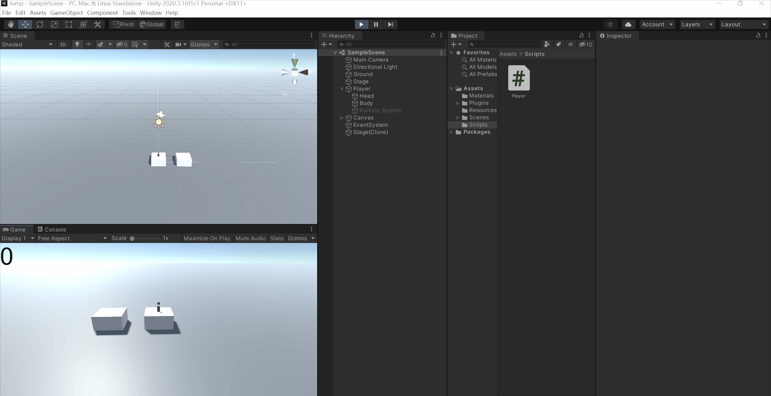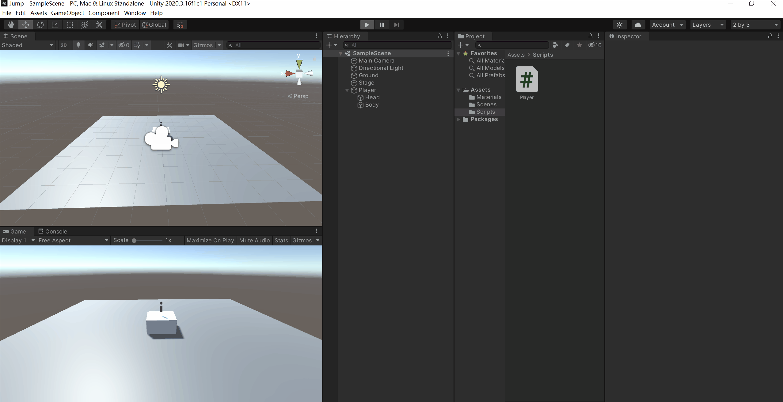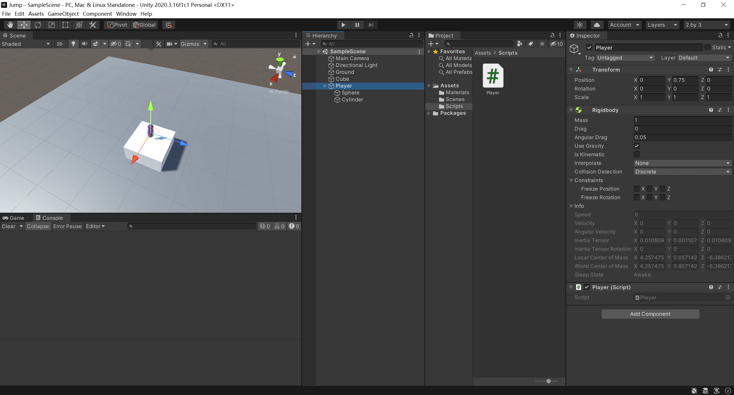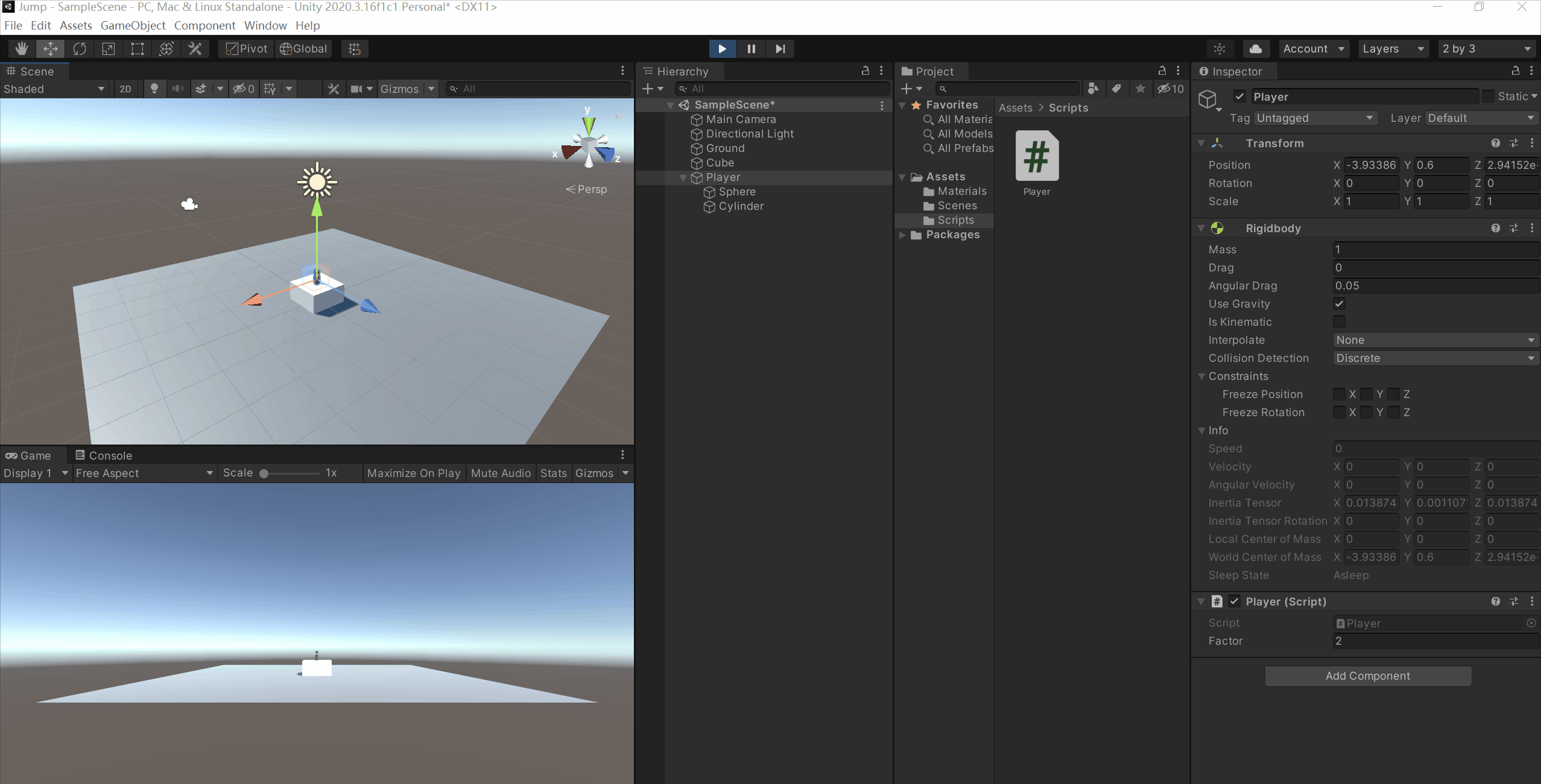 Player放入新创建Scripts文件夹,并将脚本绑定到Player控件上,并在Player控件上添加一个物理组件Rigidbody