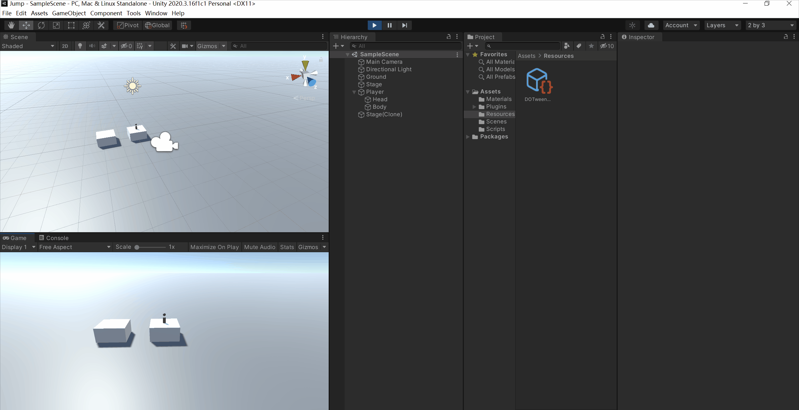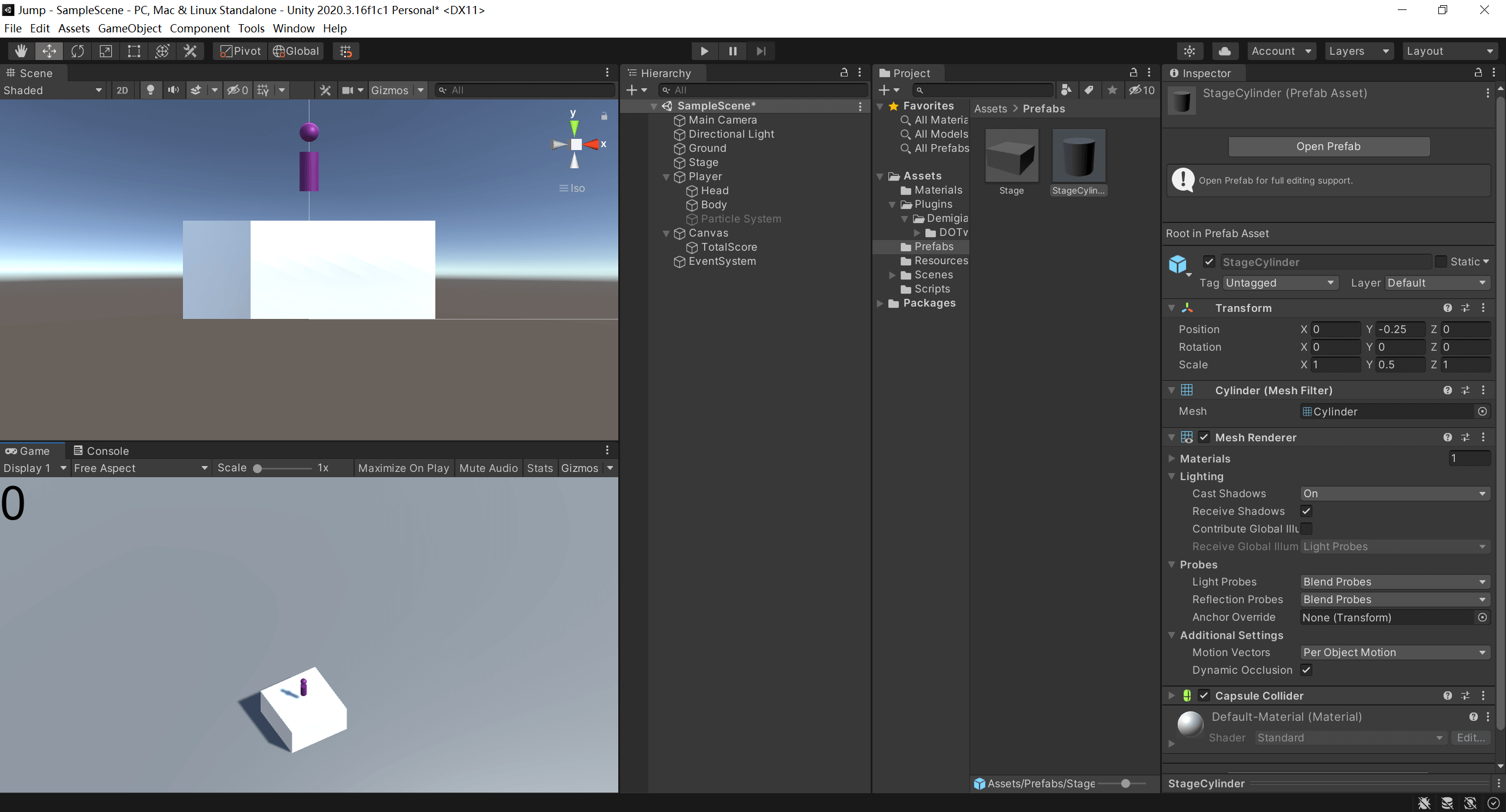 Cube,y轴缩放0.5当跳板,创建物体可以通过Transsform中Reset设置为3D场景正中心,在创建一个Plane当地面,跳一跳小人物碰到地面时游戏借宿,为了让跳板出现地面上方,设置y轴Postion为0.25(Reset设置居中是以组件正中心)